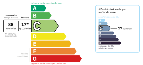 Information d'affichage énergétique sur ce bien : classe ENERGIE C indice et classe CLIMAT C indice 17.